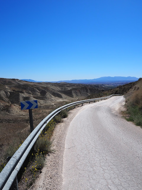 Mit meiner Route durch die Gorafe desert wurde das Terrain hügliger. Die Strasse wurde zur Sand-, Kiespiste welche sich durch die staubige Landschaft schlängelte. Es verwunderte mich, dass es in dieser Region tatsächlich bewohnte Häuser und Siedlungen gibt. Manche sind wirklich sehr abgelegen und heruntergekommen und doch gabe es Zeichen, dass diese bewohnt waren. Leider hatten manche dieser Orte aggressive Wachhunde die mich bellend und zähnefletschend fortjagten, als ob es dort etwas zu beschützen gäbe...
